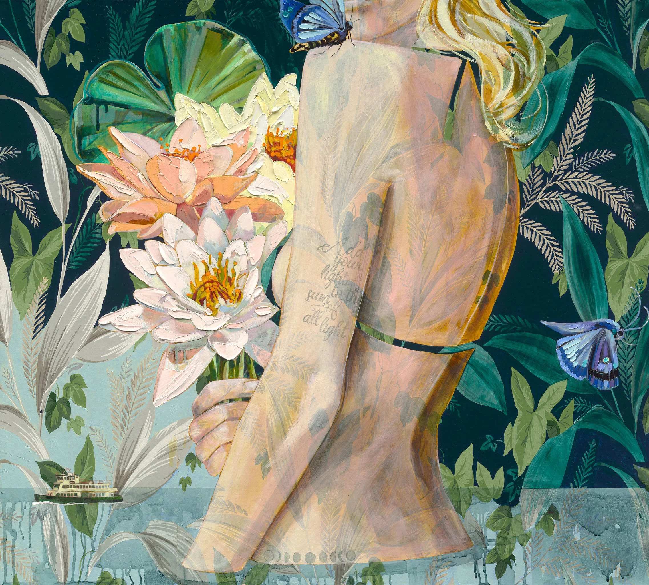 Her figurative subjects feel both intimate and expansive, often stepping beyond interior spaces into open landscapes — a quiet rebellion against traditional boundaries, and an invitation into possibility. Her work moves between softness and resilience, tenderness and power.