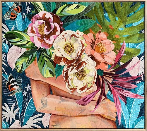 Jessica Watts’ work explores modern femininity, blending nostalgia and empowerment through a richly inventive mix of artist oils, house paint, wallpaper and domestic materials. Her paintings reframe the language of home — wood panelling, tiles, concrete and florals — transforming familiar textures into bold statements of identity, freedom and joy.